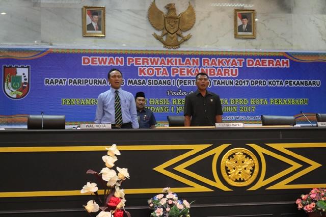 PEKANBARU - Trikriau.com - DPRD Kota Pekanbaru, Senin (20/3) menggelar rapat paripurna penyampaian laporan hasil reses anggota DPRD Kota Pekanbaru masa sidang pertama tahun 2017.