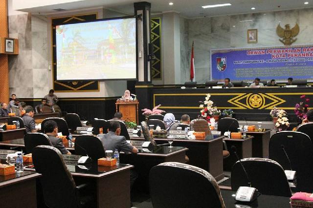 Rapat paripurna dipimpin oleh Wakil Ketua DPRD Kota Pekanbaru Sigit Yuwono, sementara Pemko Pekanbaru diwakili oleh Sekretaris Kota (Setko) Pekanbaru M Noer. (adv/DPRD Pekanbaru/ram)