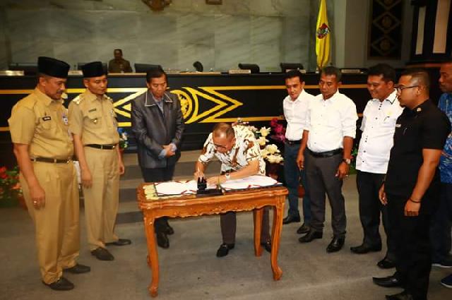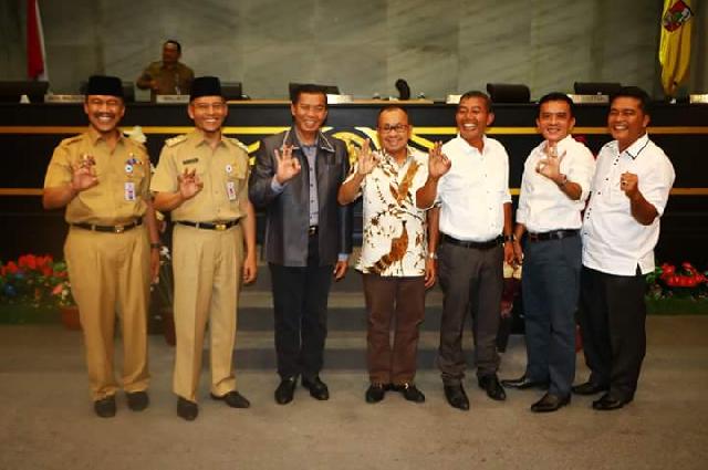 PEKANBARU - trikriau.com - Dalam rapat paripurna di Gedung DPRD Kota Pekanbaru yang langsung dipimpin oleh Ketua DPRD Kota Pekanbaru Sahril SH didampingi pawa Wakil Ketua DPRD, Sigit Yuwono ST, Jhon Romi Sinaga, dan Sondia Warman SH MH telah dilakukan Acara penandatanganan Nota Kesepakatan Kebijakan Umum Perubahan Anggaran (KUPA) dan Prioritas Plafon Anggaran Sementara (PPAS) Perubahan APBD Tahun Anggaran 2017, Senin (25/9/2017)